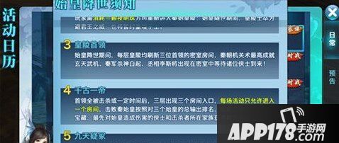 始皇降临于每周四、周日22:00开启,先同步在秦始皇陵不同的区域出现玄天武机、李斯、白起各三个BOSS,然后再出现三个终极BOSS秦始皇。多数少侠以家族为团体参与,击杀BOSS后一定程度的随机获取黄金装备图谱、同伴、魂石、帝皇令、和氏璧等稀有资源,参与的家族根据获取资源的多数分享最后的成果。