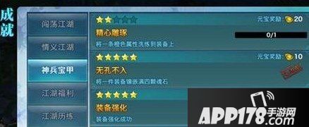 目前,在《剑侠情缘手游》中共设有209项成就,分属于闯荡江湖、情义江湖、神兵宝甲等7种成就类别中。成就系统位于角色信息界面中,奖励元宝从5元宝到500元宝不等,成就达成难度越高,奖励越丰厚。