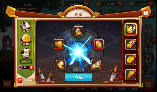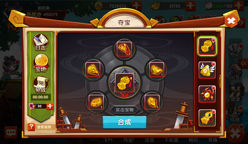 闯荡人、仙、魔共存的世界,干的又是拯救世界这样的大事,身上肯定得准备上几样神兵利器傍身。《囧西游2》中玩家麾下的英雄每位除了拥有四件基础装备之外,还携带着两个宝物栏,能够装配宝物。打开游戏界面右下角的菜单“夺宝”栏,就能看到宝物的合成栏。宝物需要一定数量的对应碎片才能够合成,玩家可以点击自己想要的宝物查看所需碎片,而宝物碎片才是夺宝玩法的精髓所在。