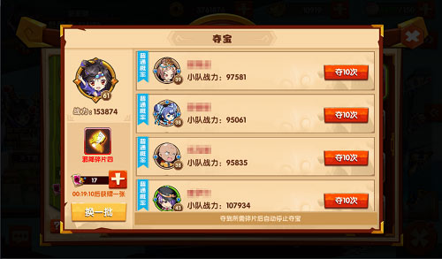 玩家点击所需的碎片,即可进入真正的夺宝界面,系统将会自动匹配出拥有该宝物碎片的玩家和其的战力,玩家则要在列表中选择想要抢夺的对象。记住,都说“名剑赠英雄”,想要获得宝物自然需要与之相配的实力。所以玩家必须审慎衡量自己的实力,根据系统提示的高低概率对对手进行分析选择。但小心,夺宝机会并不是无限次的,每一次夺宝都会消耗一张夺宝券,夺宝券需要30分钟才能恢复一张,且最多只能存储30张。玩家能够连续10次进行夺宝,当抢夺到自己所需的碎片后系统将会自动停止夺宝,节约珍贵的夺宝券。对方也能够对你发起夺宝攻击,想保护好自己珍贵的宝物碎片就挂起免战符吧,它能保护你两个小时内不被他人夺宝。