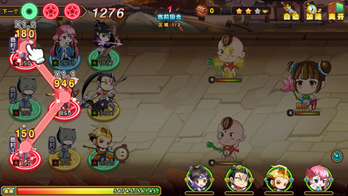 《囧西游2》的独特之一就在于游戏的战斗模式,一开始小编还以为是简单的连连看,但却发现其中的连线暗含杀机。玩家通过对九宫格的连线点击来产生伤害,相同颜色的底盘才可进行连线。连线越多,造成的伤害就会越大,如果达成九连击还会触发该角色全屏特效技能。诸如小悟空棒棒糖的愤怒,通天教主霸气的英姿,不过小编还是比较喜欢二郎神的特技,毕竟他比较帅。