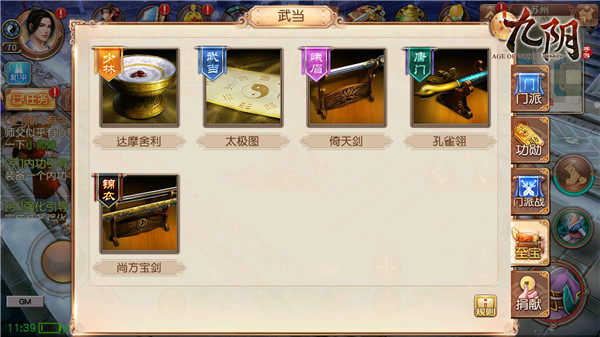 五大门派传承悠久,能人辈出。每个门派都拥有一件镇压气运的门派至宝,古老相传只要夺得其他门派的至宝,即可刮分其他门派的气运,让本门弟子的运道更旺,实力更强。门派至宝只会在门派战中显现,分别是少林的达摩舍利、武当的太极图、峨眉的倚天剑、唐门的孔雀翎和锦衣卫的尚方宝剑。五大门派围绕着五大至宝,两两展开浴血厮杀,每门200名参战玩家通过浴血厮杀来夺取对方的门派至宝,400人激情对决即刻上演。