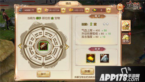 宝物精炼优先推荐:在精炼宝物的选择上,优先选择增加攻击强度的宝物进行精炼,可着重对金属性和火属性宝物精炼迅速提高攻击强度。