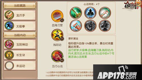 3)主武学:龙爪手 副武学:太极拳 门派内功:玉阳神功 江湖内功:长生诀 心法槽:五行心法、残阳功、血海刀罡