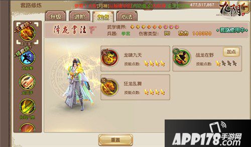 进阶加点推荐:怒招狂龙乱舞4点(可增加本套路攻击力和自身伤害减免)、实招龙啸九天4点(让该招式附带提升暴击率、暴击目标致人昏迷、黄霸体、提升闪避率和血量较低时增加高额伤害)、架招战龙于野1点(提升减伤能力和【酣战】持续时间)