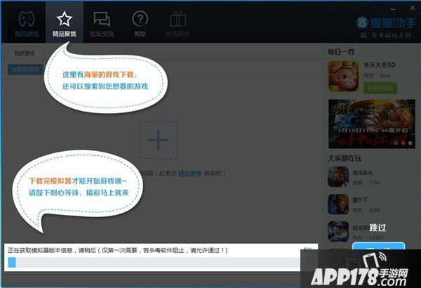 第二步,自动打开猩猩助手并下载模拟器,仅此一次,若杀毒软件阻止,请允许通过!