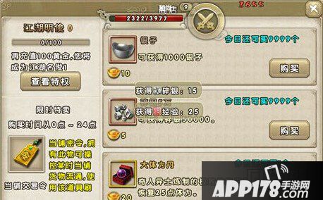 在游戏中玩家可以在商城系统中购买大量提升自身实力的物品,比如说银子、碎银、修为、体力等等。