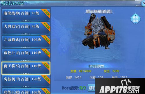 140级BOSS:狮王将军,位于蓝羽都,掉落5阶(150级)装备。