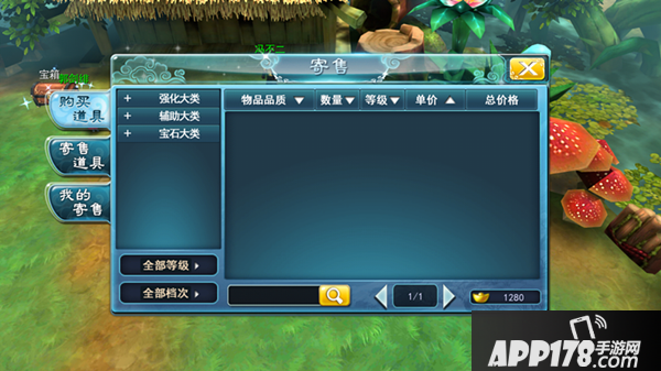 寄售系统中的购买界面比较明晰,左边是可交易物品的分类选项,具体有强化、宝石、辅助三大类,每个大类点击后可展示详细分类。分类选项下方是物品筛选选项,可以对搜索物品的等级、档次的条件进行筛选。界面的正下方是一个搜索框,可以通过输入关键字来搜索物品,比如你想搜索试锋石,直接输入就能查询出相关道具。页面的中间是展示物品列表,分别展示出物品品质、数量、等级、单价、总价格等类别信息,这些类别信息可以通过点击来进行升序或降序排列。