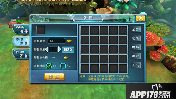 寄售界面设计的十分简明,左边是物品的出售界面,在这里你可以选择物品的寄售单价、寄售数量、寄售时间等信息,右边展示出来的是你的商品列表,寄售时可以手动输入寄售单价,寄售物品卖出后将收取10%的交易税,小数点后余额将不会扣取哦~