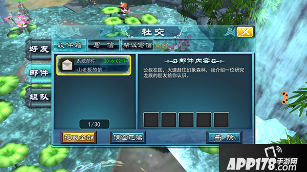 游戏内可以给好友发送私信,收到信后可以在收信箱直观的看到邮件内容,不许要单独点开邮件。当收到有附件的邮件时,点击提取全部选项就可以一键提取全部附件啦!