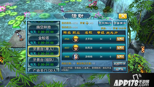 牙兽台分为单人和组队两种玩法。单人玩法是通过挑战排行榜上与自己排名相近的玩家,不断提升自己的排名;组队玩法是指玩家通过自己组队或随机组队的方式,参与队伍竞技匹配,固定时间内击杀敌方队伍全部玩家为胜。无论胜负玩家在牙兽台PK中都将获得荣誉值奖励,获胜玩家获得奖励较多。