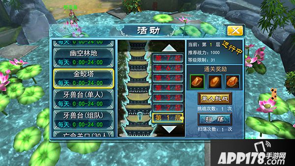 金蛟塔是一个单人活动副本,在金蛟塔内玩家将从第1层开始挑战,成功打通后可继续往上挑战,共计100层,每打通一层即可获得层数奖励。打过的层数越高,奖励就越丰厚哦!