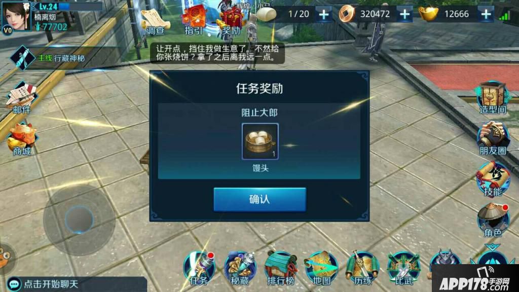那就是:当你在主城里四处游走,发现武大郎时,你去拦着他,他有几率送给你一笼馒头,也是不错的选择。如下: