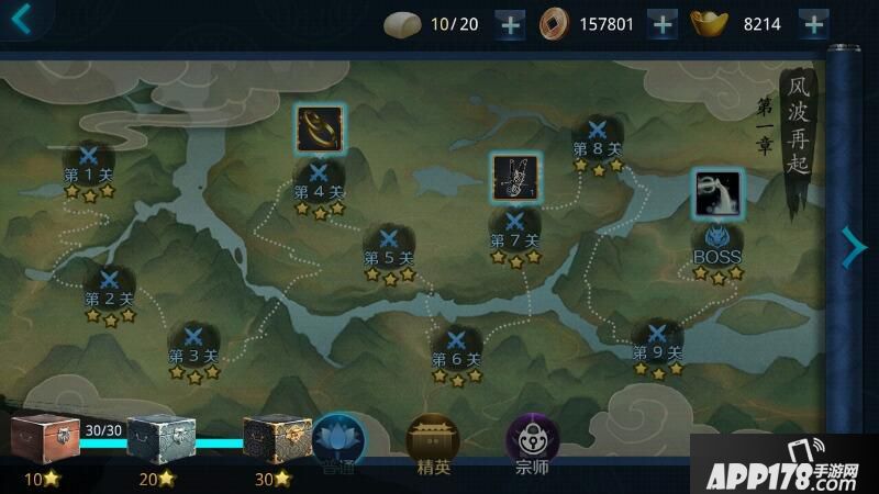 3.副本每一章节里,通过副本关卡后,按照通关完成的条件,会有三个星的评价,而全部关卡都通过过,可以根据拥有的星数评价去开启宝箱,10★开启第一个宝箱开启就可以获得1w的铜币了。通关精英副本的关卡,奖励更丰富。