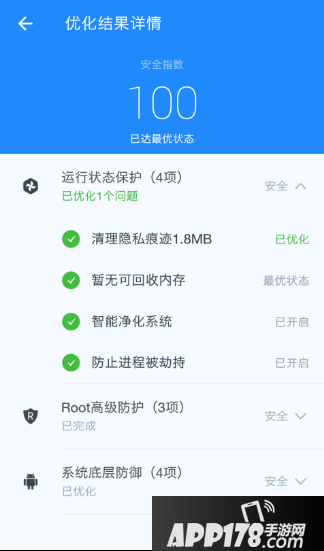 为了全面提升手机Root之后的手机系统安全性,免受木马、恶意软件的攻击和侵害,KingRoot对Root运行状态进行有效管控,保护高权限下的隐私安全,同时增加了对风险软件的鉴别功能,防止恶意软件获取Root权限对手机进行恶意操作。