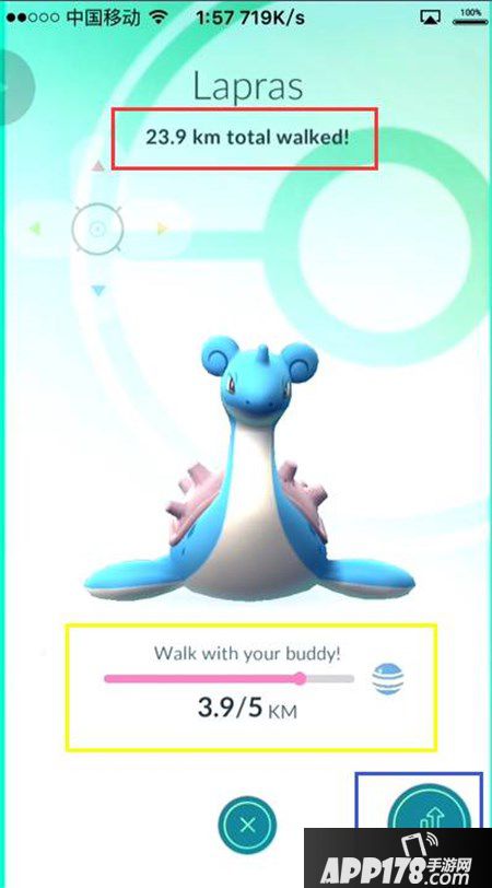 你就可以看到自己和精灵伙伴一起走了多少里程了,达到一定的里程数就可以活动该精灵的糖果哦。是不是再也不怕没糖果进化了呢。按下右下角的按钮,可以切换你的精灵伙伴。
