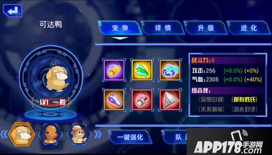 主界面中点击“队形”图标进入“宠物界面”,选择精灵所携带装备后可以针对所选中装备进行强化。