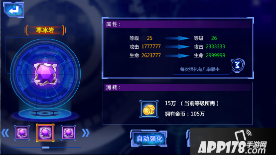自动强化:点击“自动强化”后系统自动将此装备强化至最高级(不超过人物等级),或金币不足时停止强化。