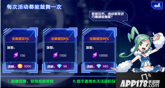 鼓舞有3种:全体加攻击1%、全体加攻击5%、全体加攻击30%,各自消耗不同。