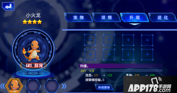 从主界面点击“队形”在上方导航栏(宠物、详情、升级、进化)中点击“升级”到达此界面