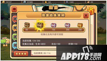 收集武将、坐骑、武器、防具图标就能在【君主-图鉴】里领取收集奖励,宝箱里面有防具进阶的必备品精铁,收集越多的武将和装备就能开启更多的宝箱。