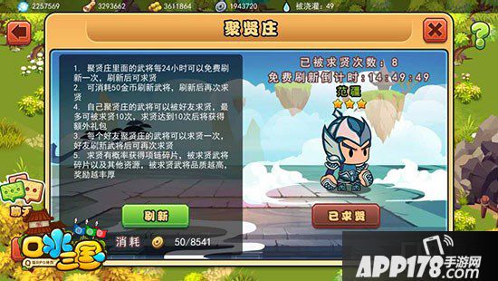 可免费向武将求贤一次,可花50金币刷新;