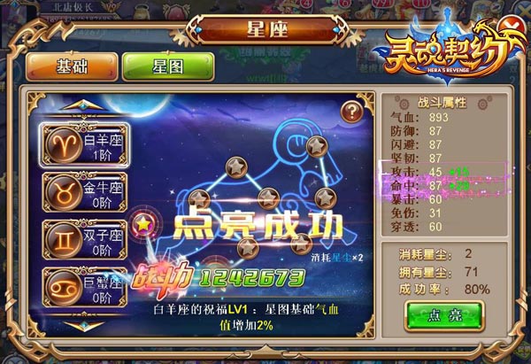 在游戏中,我们的星座系统依旧还是分为12个星座。但是每个星座被安排的对应一个属性,玩家通过修炼星座可获得属性加成:白羊座(气血)、金牛座(防御)、双子座(闪避)、巨蟹座(坚韧)、狮子座(攻击)、气血处女座(命中)、天秤座(暴击)、天蝎座(免伤)、射手座(穿透)、摩羯座(气血)、水瓶座(防御)、双鱼座(攻击)。大家可以先全部修炼,全方位提升自己,到了后期再条件允许的情况下,单独修炼某个或者某几个所需星座就可以啦!