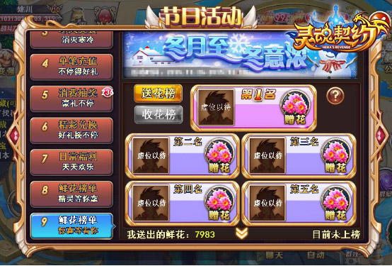 同时玩家们也别忘记了还有日常活动也可以得到冬月活动的相关兑换道具呢,并且有更高概率刷出紫色、橙色品质任务或者礼包之类的福利。如果积极参加送花游戏的话,送花榜前三名和收花榜第一名,且达到5000朵的,即可获得冰霜剑士精灵激活卡一张,还不赶紧出手?