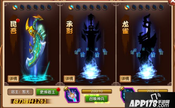 神兵可以进行洗练,没把神兵均有不同的三个属性和一个神兵技能,以昆吾为例,它拥有【生命】【攻击】【暴击】3个属性,神兵技能为【天怒】:每击杀一名敌人,额外获得10点怒气
