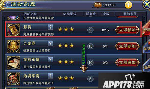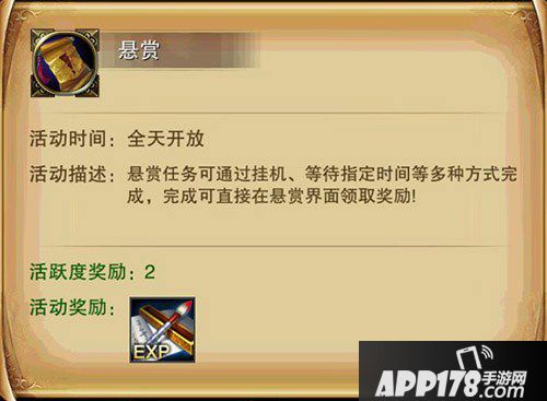 进入悬赏的方式十分简单:在活动列表当中选择悬赏活动即可。悬赏任务属于全天开放的活动之一,玩家们可以通过挂机杀怪或者等待一定时间两种不同方式完成,完成之后便可以直接在悬赏界面当中领取奖励。悬赏每天可以完成十五次,每次头可以获得一定的经验值与两点活跃度的奖励。