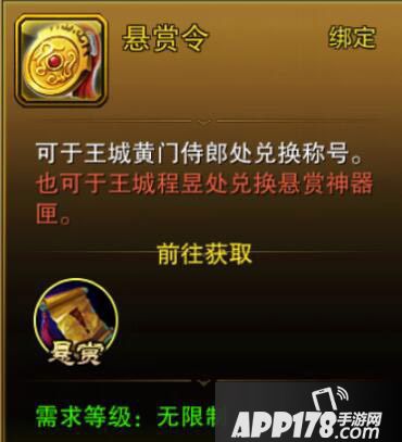 刷完指定数量的怪物之后,或者说等待一定的时间之后,玩家们可以通过任务面板再次进入悬赏界面完成任务,完成之后便可以获得经验值与悬赏令。悬赏令可以在王城黄梦侍郎处兑换称号,也可以在程昱处兑换悬赏神器匣。