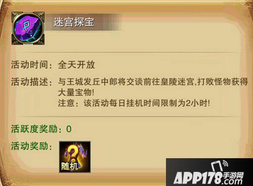迷宫探宝是手游六龙争霸当中全天开放的活动之一,玩家们可以在其中获得各式各样的道具以及经验值。与王城当中的发丘中郎将进行对话即可进行迷宫探宝。需要诸位玩家们注意的是:每一位角色每日进入迷宫的时间限制为两个小时。