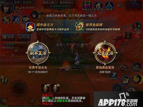 进入战场后,就会遇到其他玩家,对战中如果死亡,则可以选择副本复活或者完美复活两种方式。副本复活需要消耗一定的秒数,自动复活,完美复活花费钻石可以原地满血复活。如果是与对手战力差距较小,对手血量不多了,可以选择完美复活,起来后尽量击杀对手,获得积分,以免对手逃跑。否则则可以选择副本复活。