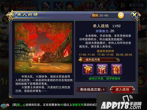 在六龙争霸3D中,当玩家等级达到52级的时候,就可以开启单人战场玩法。每天有三次开启时间,分别为11:40-11:45;17:40-17:45;20:40-20:45。每次进入需要20体力,击杀怪物后可以开启宝箱。杀死其他玩家可以获得积分。进入后为单人的混战模式,每个人都可以互相攻击,所以低战力玩家要小心。今天,小编就给大家带来单人战场的玩法介绍,感兴趣的玩家和小编一起来看看吧。