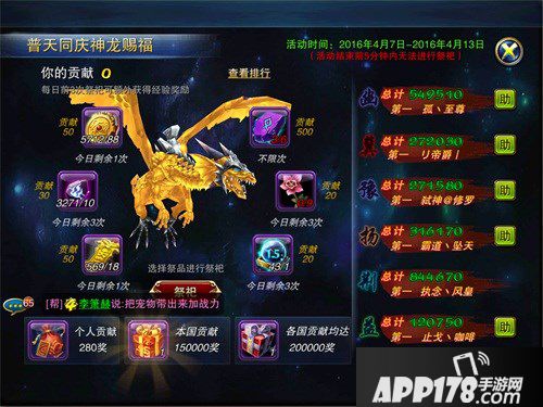 礼包分为个人贡献奖:280奖可兑换,打开可随机获得一张东周卡牌;本国贡献奖:打开礼包可随机获得一颗6级宝石;当各国贡献均达到200000奖时更可获得神龙奖励。祭祀界面的旁边是服务器当前的祭祀排名,玩家们可以服务器的即时排名。活动时间为4月7日——4月13日,玩家们一定要多多参与哦。