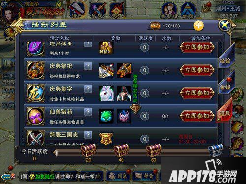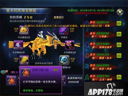 活动期间每日想年度庆典神龙祭祀物品,贡献达到一定数量即可领取奖励,活动结束时更有怕哦行帮好礼。