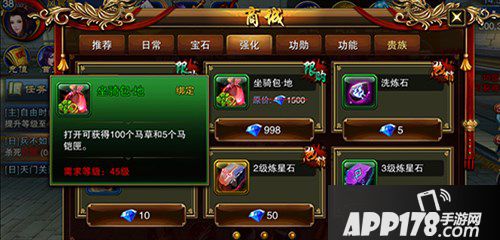 另外一种方式就是大家所喜闻乐见的直接在商城当中买买买了。在商城当中有两种坐骑包供玩家们选择:坐骑包·人需要168钻石,礼包当中只包含了20个马草。而坐骑包·地则较贵,需要998钻石。自然里面的内容十分的丰富,一共有100个马草和五个马凯匣。