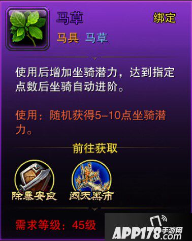 当玩家们达到45级的时候就可以对坐骑进行培养了,坐骑培养进阶之后能够大量提升坐骑对玩家们是的属性加成,从而为玩家们提供更加强大的实力。而坐骑的品阶提升就需要我们的马草登场啦。