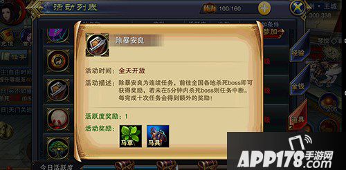 目前来说马草能够在副本活动当中的除暴安良活动中获得一定数量的马草,除暴安良为全天开放的连续任务,需要玩家们前往全国各地杀死BOSS才能够获得奖励,如果在五分钟能没能够杀死BOSS的话任务则会中断,每完成十次任务之后玩家们便可以获得额外的奖励哦。