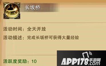 玩家可以直接从主界面的长板桥系统进入,里面的任务没有时间限制,玩家可以随时进入。积极参与里面的活动可以获得很多经验值。还有可以积累活跃度来开启活跃度宝箱。