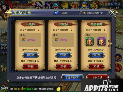 找回系统在游戏的功能选项中,玩家们点击找回之后就可以进入找回系统了。找回系统的奖励很多,除了高额的奖励之外,还有各种神器礼包和兵器礼包。运气好的话还可以遇到虎符奖励、韬略果及荣誉奖励。玩家们每天可找回一次奖励,找回的方式分两种,一种是用银两找回,一种是用钻石找回。