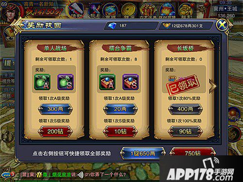 除了以上的重要任务要手动做完之外,剩余的任务,不想做的,可以第二天奖励找回。找回有两种方式,一种是银两,一种就是钻石。如果每天能够拿到活跃度奖励和今日推荐的钻石,那么可以考虑用钻石来找回,获得100%的奖励。如果钻石不够,那么就只能选择银两找回80%奖励了。