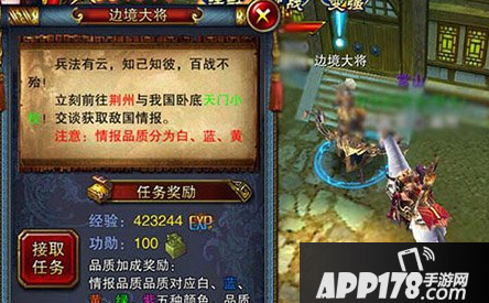 准备工作做好之后就可以前往敌国边境啦!在右侧的任务栏当中可以提醒诸位玩家们要去的国家,这样就不用担心在跨国传送那位姐姐那里点错跑到别的国家了。在敌国找寻到天门小校之后,套取情报之后赶紧撤离吧。后方你的敌人可是眼睁睁的看着呢!不过他们挺友好的,会送给玩家们一个免费回城。 或到本国边境,便可以像边境大将交付任务啦!经验值、功勋还有无双礼袋哦!这个任务每天可以完成两次,国探的时间是两个小时,足够玩家们交付任务。