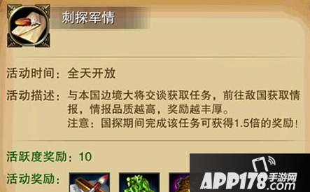 首先我们需要来到边境大将处,得知我们需要去敌国(随机刷新)与我国卧底天门小校交谈获取帝国情报,此外我们也可以看到情报同样分白、蓝、黄、绿、紫五种不同的情报品质。推荐实力不强的玩家们在去敌国的时候备好一块免战牌,这样敌人就没办法对你出手啦!不过你同样也不能攻击别人。免战牌可以从活跃度奖励当中获取,也可以直接在商城当中购买。