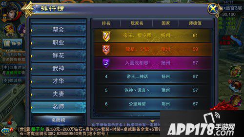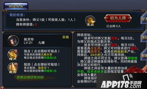 师徒系统不管是对师父还是徒弟好处都是显而易见的。师徒通过互送道具隐贤玉和合生酒,徒弟可以获得大量经验,初期可以算是原地站着也升级啦!师父通过徒弟的努力升级和活跃度可以获得大量奖励,同时可以获得师德值,师父的师德值会进入排行榜,并且还有对应的拉风称号可以领取,所以追随潮流的师父们一定要经常给小徒弟加油打气,一起努力提升战力,上阵杀敌!