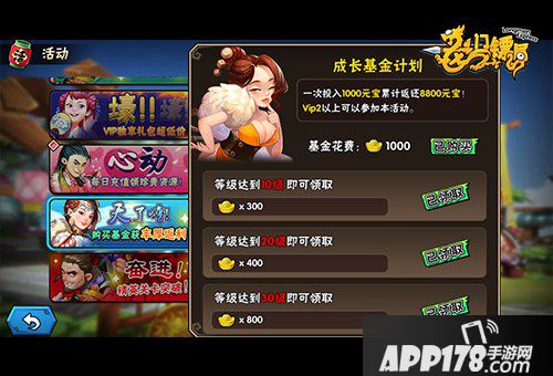 基金成长计划说白了是个十分简单的活动,VIP2以上就能参与,门槛很低。累计充值30元就能达到VIP2参与活动,实惠档的话推荐大家购买“月卡+6元”或者直接买“30元首充双倍”,这样刚好能达到V2。如果不差那几十块钱的话,当然还是买98元的终身卡更划算,这两种卡每天送的元宝和磨练扫荡卷都很不错。