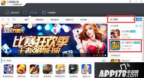 安装口袋模拟器之后,进入模拟器界面,右上角搜索龙门镖局手游。