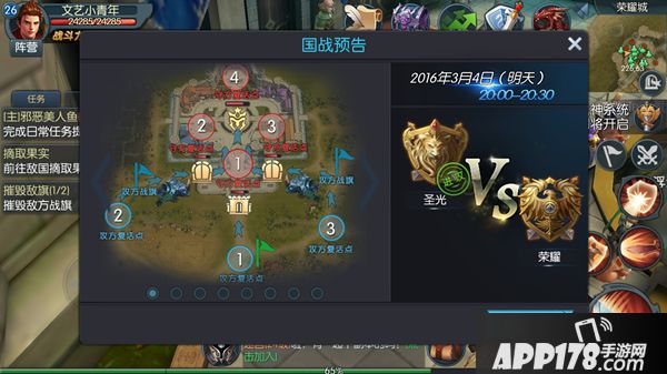 国战开始后,攻方国王可以派遣攻城兽进攻,攻城兽能对城门、雕像和沿途的玩家造成大量伤害,攻方玩家跟着攻城兽进攻能迅速的破坏城门。而守方玩家不要在城里逗留,需要竭尽所能去阻止攻方破坏城门,可以通过城内水池边的传送圈达到城墙上,再通过城墙上的传送圈来到城外,攻击敌方玩家和攻城兽,也可以选择去破坏攻方战旗来削弱攻方的buff加成。