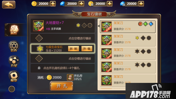 在镶嵌宝石之前,首先需要给装备开孔。开孔有可能出现圆形、方形或者六芒星形的。圆形宝石可以增加攻击力,方形宝石可以增加护甲或者魔抗,而六芒星宝石可以增加生命值。